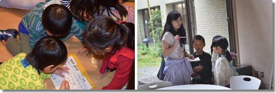 | メイン活動となる登山が、雨のため中止となり、館内での活動となりました。スコアビンゴでは、館内に設置した46音のひらがなの書かれたポストを探しました。ビンゴカードには、ひらがなで「あ」から「ん」までを、小学生が中心となって、年長さんと協力して書いていました。なかなか見つからないポストを探し回って、疲れた様子もありましたが、最後まであきらめずに探すことができました。 |
