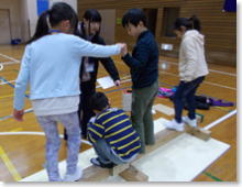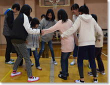 ウィンターきずなの森では、「@ブラインドスクエア」「Aラインナップ」「Bジャンボシーソー」「C人口密度」「Dバランスウォーク」「Eフラフープ送り」の6種類のアクティビティーにチャレンジしました。はじめは緊張した様子が見られましたが、グループで協力して活動をしていく中で、少しずつ笑顔が見られるようになりました。