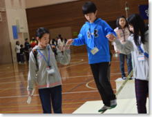 約5p幅のロープの上を、時間内に落ちないように何人渡り切れるか、チャレンジします。 |