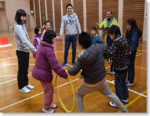 手をつないだまま、フラフープを送ります。頭から?足から?手を使って?様々な工夫ができます。 |