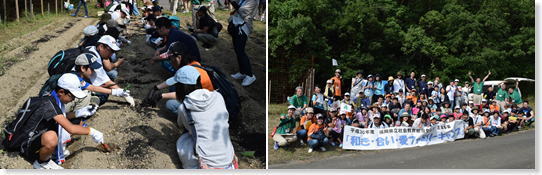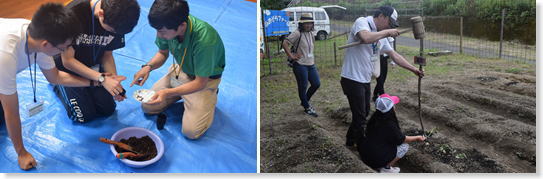 | メインのプログラムである農業体験です。翌日の天候が心配されたため、急遽1日目に行うことになりました。今年度の苗植えは、「サツマイモ」と「落花生」です。落花生は、ポットから取り出す作業から行いました。なかなか取り出すことが難しい参加者もいましたが、ボランティアスタッフと一緒に、工夫をしてやり遂げることができました。次回の収穫が楽しみですね。 |