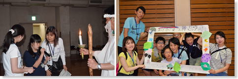 | 夜の活動ではキャンドルのつどいを行いました。ご家族には「この3回シリーズのキャンプでがんばること」について誓いの言葉を言っていただきました。それぞれのご家族の想いの詰まった言葉は、感動的でした。2部では2〜3家族ずつで手作りフォトフレームを作って、写真を撮りました。オリジナルのフレームに納まった、家族のみなさんの笑顔が素敵でした。 |