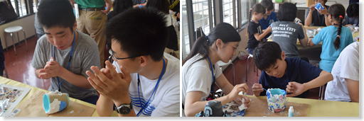 和き・合い・愛ファミリーキャンプ第1回目の最後の活動は、親子で分かれての活動です。子どもたちはペン立てづくりを行いました。ねんどをコップに貼り付けて、思い思いの飾りつけをしました。個性あふれる作品が出来上がりました。