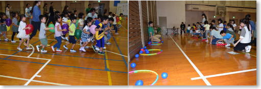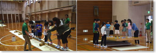 | きずなの森プログラムでは、フラフープリレーやラインナップ、ジャンボシーソー、人口密度、バランスウォークに挑戦しました。みんなで目標を達成するために、積極的にチャレンジしました。スタッフのお兄さんやお姉さんに手を添えてもらいながら、活動することができました。どの班も、自分の考えを出し合って話し合う場面が見られ、協力して活動することの大切さを学ぶことができました。 |