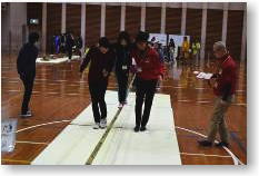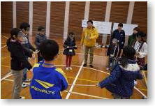 | ウィンターきずなの森では、「@ブラインドスクエア」「Aラインナップ」「Bジャンボシーソー」「C人口密度」「Dバランスウォーク」「Eフラフープリレー」の6種類のアクティビティーにチャレンジしました。各アクティビティーで、説明・作戦タイム・チャレンジタイムを12分間設け、高学年を中心に話し合いをすすめ、班のメンバーと協力する姿がみられました。 |