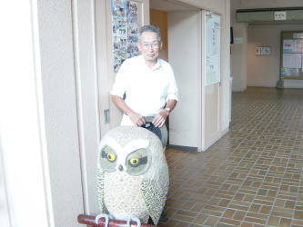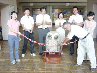 創作過程をずーと見ておりまして、ただの「木」がだんだんと出来上がっていくにしたがい、木製の「コノハズク」に息が吹き込まれ、生きた本物の鳥のようになっていくことに感動しました。出来上がった「コノハズク」はとても愛きょうがよく、かわいらしく仕上がっており、センターのマスコットになっています。 これから当センターにお見えになる場合、玄関で皆様を気持ちよく「コノハズク」君が迎えてくれます。 この「コノハズク」君の正式名称は「フクロウ科コノハズク属コノハズク」だそうです。 |