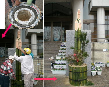 | 門松は、「若杉の会」のボランティアの方々に作っていただきました。 廃タイヤを活用した、丈夫で立派な門松です。 |