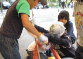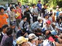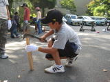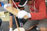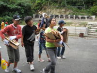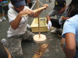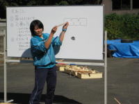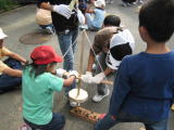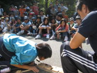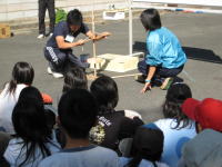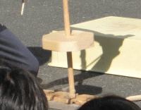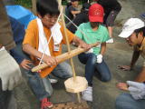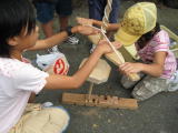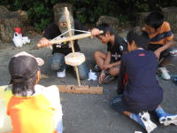 | ●センター職員に火の起こし方(昔の人の火起こし・道具の使い方)の説明を受けています。 |