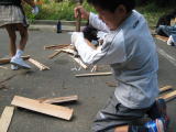 空気の通り道をつくって薪をくべないと火は燃えないね