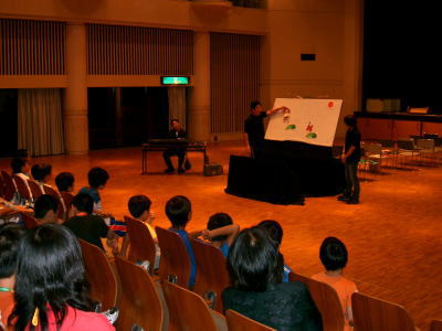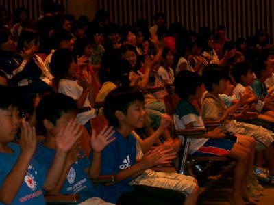 | 7/8(日)の夜は、ボランティア団体「若杉の会」によるパネルシアターです。 工夫に工夫を重ねた出し物に子どもたちは大興奮でした。 まさか花火まで上がろうとは・・・・・・・・・。 |