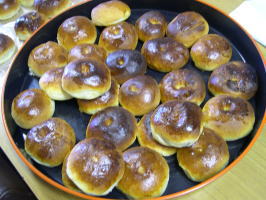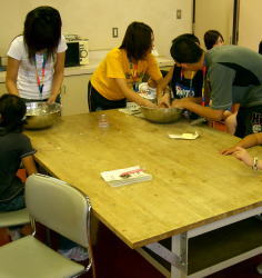 <<石焼き釜のパン生地づくり センター内の石焼き釜にてパンを焼くため、子ども達がパン生地づくりをおこないました。 |