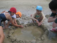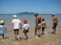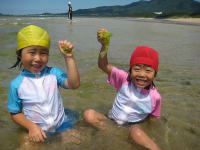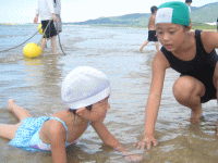 | 「玄海の家」で海水浴 | | | | エメラルドグリーン色の玄海の海は最高でした。もう一度行ってみたいな。 |  |  |  |  | | 小学生と年長さんは、海で大はしゃぎ!砂浜で大きな池を作りました。 | |