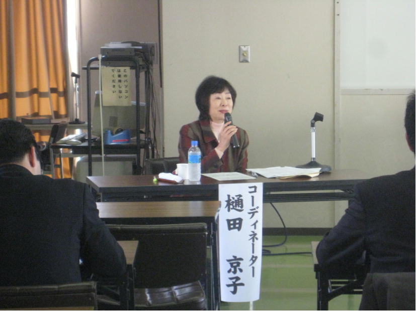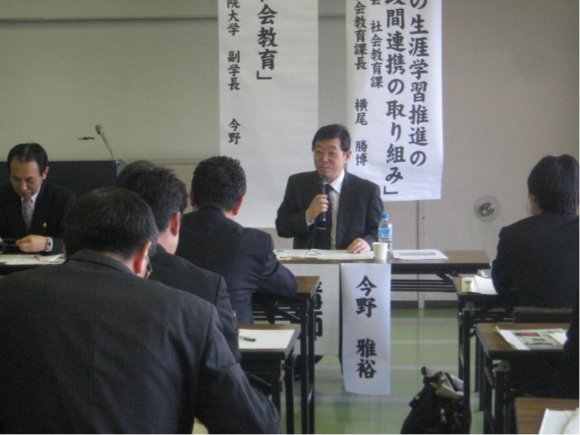 | 講演の後、当社会教育総合センターの樋田京子副所長がコーディネーターを努め、古賀市教育委員会社会教育課長の横尾勝博氏を事例発表者に『総合行政としての生涯学習推進のための行政間連携の取組』と題して事例発表が行われました |