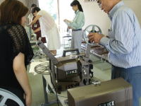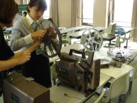 受講者の方が、16ミリ映写機にフィルムをかけて映写をおこないます。 |