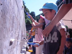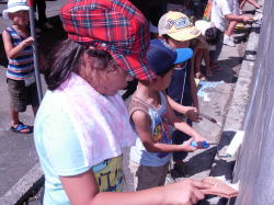 壁画制作では、絵を描く準備段階としての下地づくりをしました。道具を譲り合いながらきれいに塗ることができました。