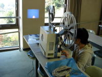 受講者の方が、16ミリ映写機にフィルムをかけて映写をおこないます。