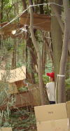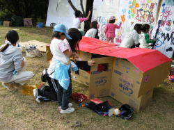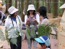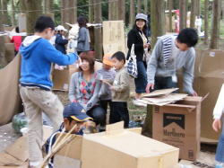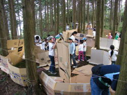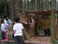 | グループコース:2歳から中学生までの超縦割りグループで裏山に「ぼくらの基地」をつくっちゃいました。段ボールやワラ、枝etc.で基地をつくったり、まきまきパンやあめづくり、お絵描きや工作…なんでもありで、子ども達は思いっきり遊んでいましたよ。 |