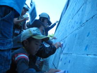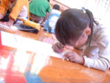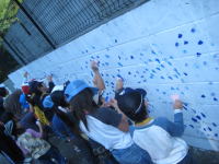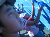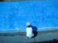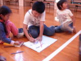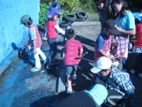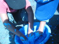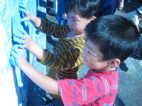 壁画制作では、絵の背景をブルー系の色で塗りました。スポンジと手を真っ青に染めながら楽しそうに活動していました。