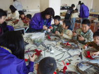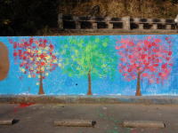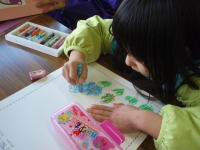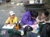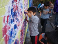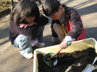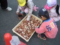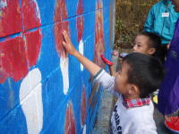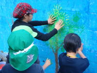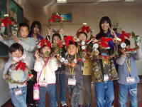 壁画制作では、あじさいや四季折々の木々の葉を手形で表し、壁画を仕上げました。チューリップの球根は、春になって世界にひとつだけの花が咲くように、一人一鉢思いをこめて植えました。また、クリスマスリース作りでは、葛(かずら)にドングリや松ぼっくり、リボンなどを飾り、家族へのすてきなおくりものができました。