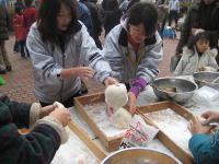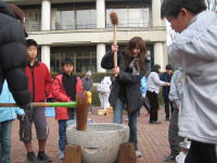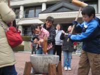 つきあがったもちをきな粉と大根おろしにまぶしていただきました |