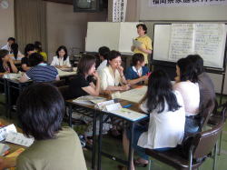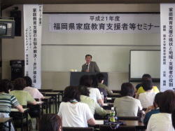7月14日に平成21年度福岡県社会教育支援者セミナーの第1回目を開催しました。このセミナーは、県内の家庭教育支援者や市町村の子育て支援・家庭教育担当者を対象に専門的・実践的な研修を行い、家庭教育支援者としての資質を向上することを目的としています。