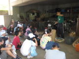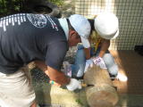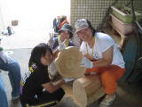記念品制作…ノコギリを使って丸太の椅子を作っています。 |