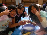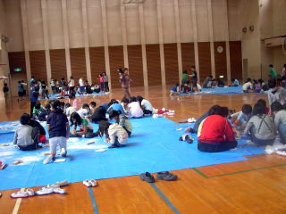 | 体育館にブルーシートを広げて、クラスに分かれて、勾玉づくりの活動をしました。 |
