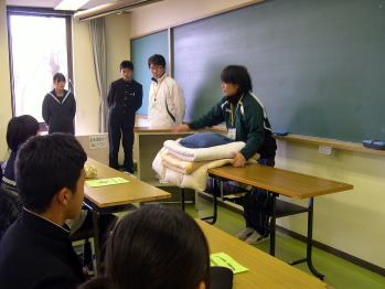 | 入所式では、センター職員からのあいさつと寝具の使い方の説明を受けます。 |