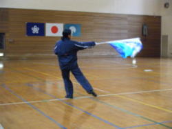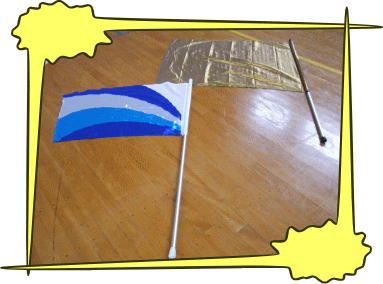 | 今回の練習で使われていたフラッグです。金色のものはご自分たちで作られたそうです。この旗より大きなものを使われることもあるそうです。 |
