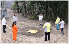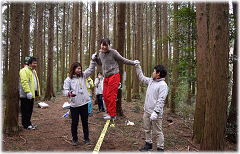 15mのロープを全員が目隠しをした状態で持ち、設定された図形(正方形や正三角形等)づくりに挑戦する。5分間の作戦タイムの中で、役割分担や実施方法等の共通理解を図っておくことが重要である。 |