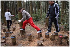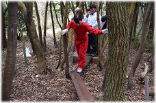 バランスを取りながら、木と木の間に張られている幅5cmのスラックライン上を渡っていくゲーム。強度の緊張感との戦いとなる。補助者の協力とチームの声掛けが欠かせない。 |