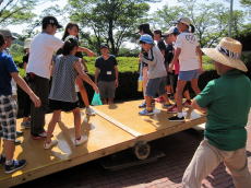 スタート台から小島(約50㎝四方の台)へ1人ずつ乗り移っていきます。全員が乗り移って10秒間地面に落ちなければ成功となります。乗り移る順番や立ち位置などが成功へのカギとなる。 |