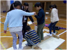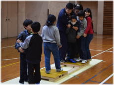チームで二手に分かれてシーソーに乗り、所定の位置につきます。そこから、シーソーの端が地面に着かないようにうまくバランスをとりながら位置を入れかわるゲーム。声掛けと呼吸を合わせた動きが成功のカギとなる。 |