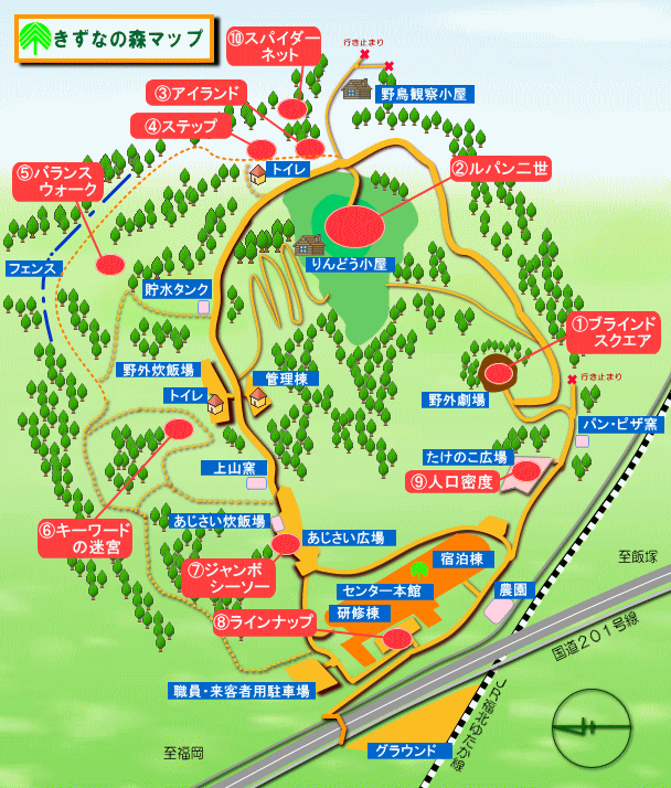 木と木の間にクモの巣のように張り巡らされたロープの間を1人ずつ通り抜けていきます。通り抜ける箇所は難易度に応じて得点がある。1人では通り抜けることはできないので、チームの協力が目標得点へ達するカギである。 |