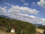 さて、この写真は館内のとある場所からの景色です。天気がよいときは奥の島がはっきりと見えます。白い雲と青い海、緑の林と、多彩な景色が見られます。夏とは違った、冬ならではの景色と雰囲気を味わえると思いますので、休憩時間に海浜散歩や窓から景色を眺めてみてはいかがでしょうか。玄海の家の利用者にたくさんこの景色を見てもらえたらと思います。(2009/11/18)