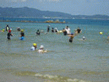 「玄海の家」の前に広がる海では、多くの研修生の皆さんが海水浴やカヌーを楽しんでいます。