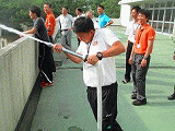 消火器体験は、水消火器を使いました。いざという時、誰もが使用できるような実践的な訓練でした。消火器の使い方のポイントは「ピノキオ」だそうです。「ピ」は、ピンを抜く。「ノ」は、ノズルを持つ。「キ」は、距離を保つ。「オ」は、ノズルを押す。