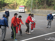 消防訓練では、宗像消防署神湊出張所の職員の方の指導の下、本物の消火器を使った消火訓練や消火栓を使い放水するなど、より実践的な消防訓練を行うことができました。