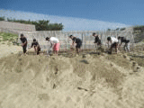 5月には海の活動を行う利用者の安全のために恒例の砂かきを行いました。海の砂が冬の強い海風に吹き上げられ、通路や海浜倉庫を埋めてしまっていました。その砂をc玄海の家の職員とお手伝いに来てくれた大学生の皆さんでせっせと砂浜まで運びました。大変な作業でしたが、無事に海浜活動を行う準備が整いました。6月1日には海開きを行い、安全に楽しく海の活動を行えるよう安全祈願を行いました。