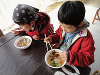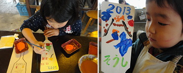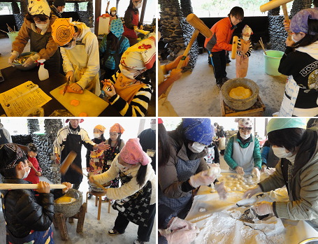 12月22日(土)に「親子deハッピーお正月」を開催しました。24組67名の家族が参加され、もちつきやお雑煮作り、羽子板への色づけを楽しまれました。子ども達は、始めは慣れない手つきでもちつきをしたり、野菜を切ったりしていましたが、回数を重ねるたびに上手になりました。自分たちで作ったお雑煮はとても美味しく、何回もおかわりをしていました。羽子板への色づけでは、個性豊かな絵を描き、親子で羽をついて楽しそうに遊ぶ姿が見られました。 保護者の方からは、「なかなか体験できなくなってきたことを子どもと一緒にできて良かった」という声をたくさん聞くことができました。