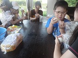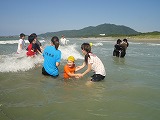 | 9月1日(土)〜2(日)に平成24年度、視覚に障害のある子どもたちの体験活動支援事業第1回「和き・合い・愛」を開催しました。1日目の活動は午後から玄海の海での海水浴でした。海水は少し冷たかったですが、まだまだ気持ちよく入ることができました。波にも上手に乗ることができました。休憩時間には、散歩や、貝探しをし、玄海の砂浜を手や足でしっかりと感じることができました。海水浴の後はピザづくりです。子どもたちが生地から作り、発酵させ、トッピングまでしました。生地を作る時にはみんな一生懸命こねていました。疲れてこねるのをあきらめかけていた子どももいましたが、みんなで声を掛け合って、しっかり作ることができました。2日目は、がめの葉もちづくりです。ピザと同じように子どもたちが生地からこねて作りました。がめの葉の香りを楽しみながらおいしく食べている様子は、とても幸せそうでした。次回、第2回「和き・合い・愛」は、1月19日(土)〜20日(日)、国立夜須高原青少年自然の家で開催の予定です。また、みんなの笑顔を見るのが楽しみです。 |