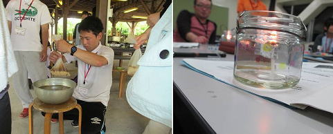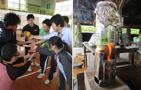 今回、人間関係づくりのためのアイスブレイクやイニシアティブゲーム、ビニール袋を使って缶詰と炊くご飯やポトフ作り、空き缶を使っての炊飯等の簡単防災クッキング、空き瓶・ティッシュペーパー・アルミホイルで作る防災ジャムランタン作り等を行いました。また1日目の夜は作ったランタンで「ランタンナイト@玄海」を行い、グループごとに1日の学びや気づきのふりかえりをしました。