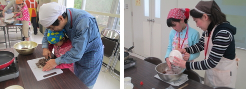 まず、親子deバレンタインクッキングでは、フライパンで作れるチョコレートブラウニー作りを行いました。みなさんとても手際よく、親子で会話を楽しく美味しいブラウニーを作ることができました。