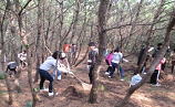 松葉かきの活動では、活動を行う前にさつき松原が潮風による被害を防いでくれていることや、その松原の松を成長させるために落ちている松葉を集めることなどの説明をしたことにより子どもたちの活動への意欲も高まり、熱心に作業に取り組むことができました。また、集めた松葉で焼いもを作ることで楽しみながらボランティアを行うことができました。