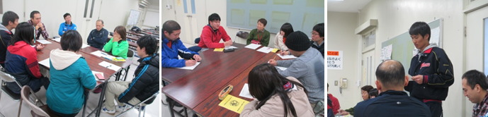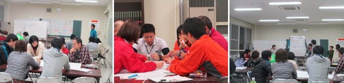 夜に行われた「人間関係作りトレーニング」では、座学で、グループの中でお互いに情報を出し合って地図を完成させるものでした。40分間という限られた時間を使って、それぞれの情報を出し合いながら、個性あふれる地図を作成していました。そのあとの情報交換会では、班を超えてたくさんの参加者同士や施設職員との交流ができました。