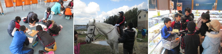 乗馬体験では、乗馬クラブ・スマイルフィールドを訪れ、3頭の馬に交代で乗りました。初めての乗馬に戸惑う子もいましたが、終わってみると笑顔で楽しかったと言う姿が見られました。