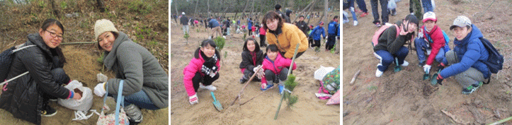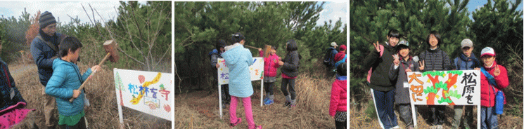 子どもボランティアサークル「タイミング」では、「ボランティアのよさ」を提供してきました。「ボランティアとは何か」ということを少しでも知ってもらい、身をもって良さを感じることができるようにしてきました。第3回目となる今回は宗像市が行う「さつき松原再生プロジェクト」に参加し、松苗の植樹を行いました。 |