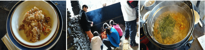 昼食は「なめたけと焼き鳥の炊き込みご飯」と「豚汁」を作りました。なめたけと焼き鳥缶の相性の良さに加え温かい汁物があり、野外で最高の料理を味わうことができました。 |