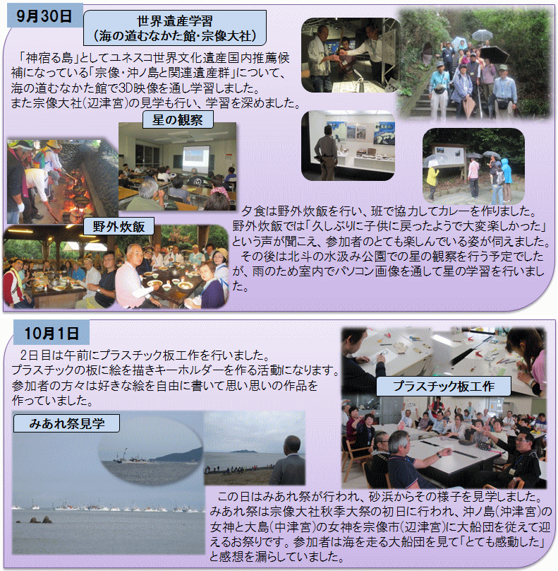 げんかい・エコクラブ、県立少年自然の家「玄海の家」共催事業としてシニアキャンプinげんかいが行われました。平成10年から始まり、今年で16回目を迎えました。今回は海の道むなかた館での世界遺産学習や宗像大社見学、北斗の水汲み学習、みあれ祭見学等を行いました。