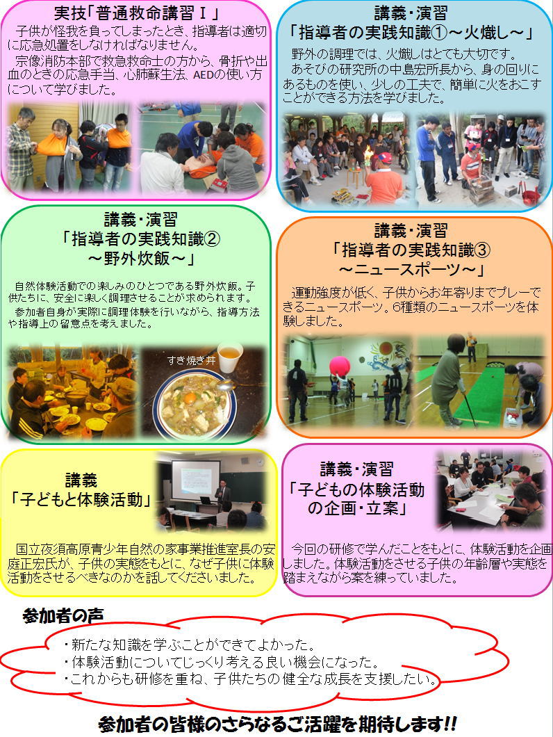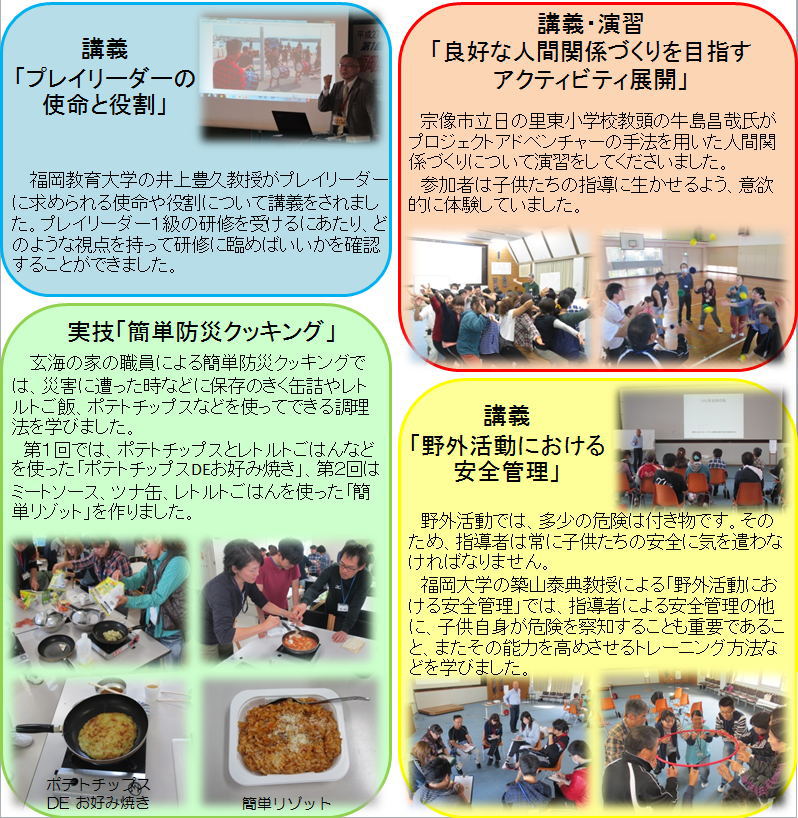 10月24〜25日、11月7〜8日、計4日間かけて、プレイリーダー1級を取得するための研修会が行われました。参加者は子供たちに体験活動をさせるための様々な知識や技術を学びました。